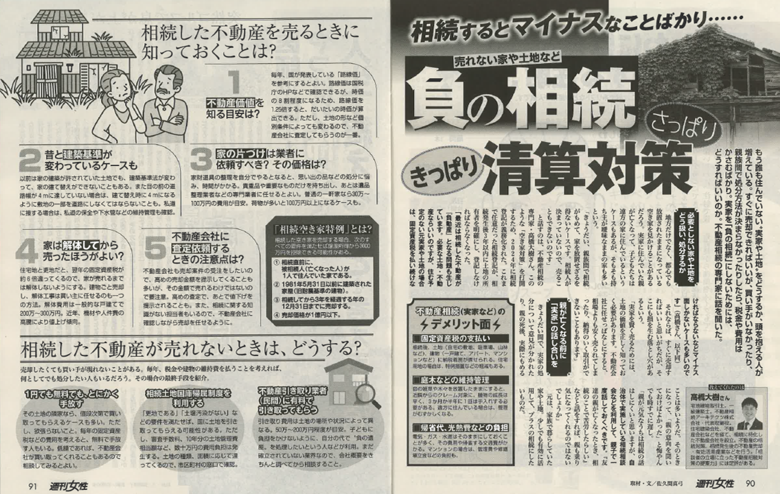 2026.02.19相続知識 週刊女性(2026年3月3日、3月10日合併号)に掲載されました。 週刊女性(2026年3月3日、3月10日合併号)に当社代表の高橋大樹への取材記事が掲載されました。 SHAREシェアする [addtoany] ブログ一覧